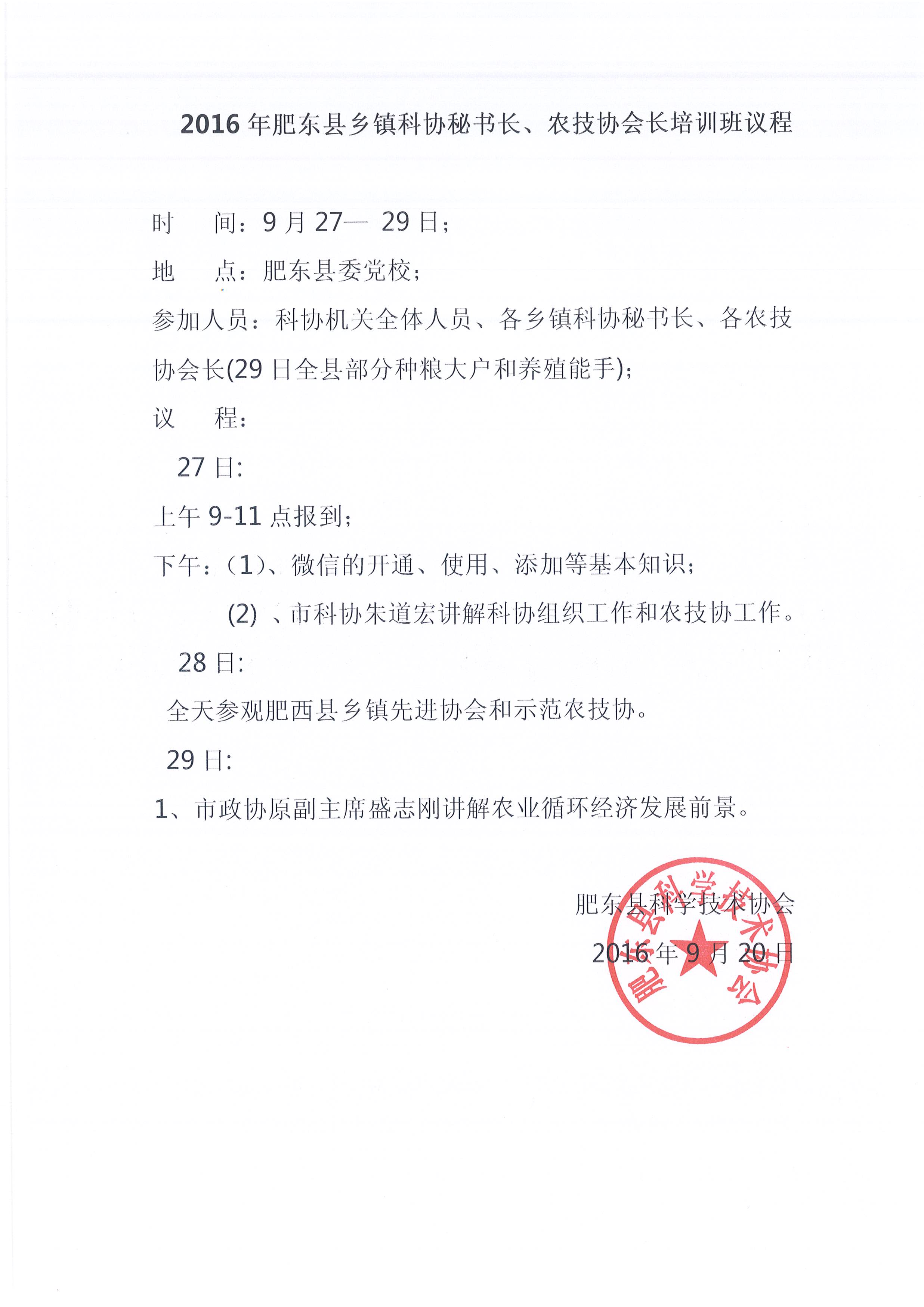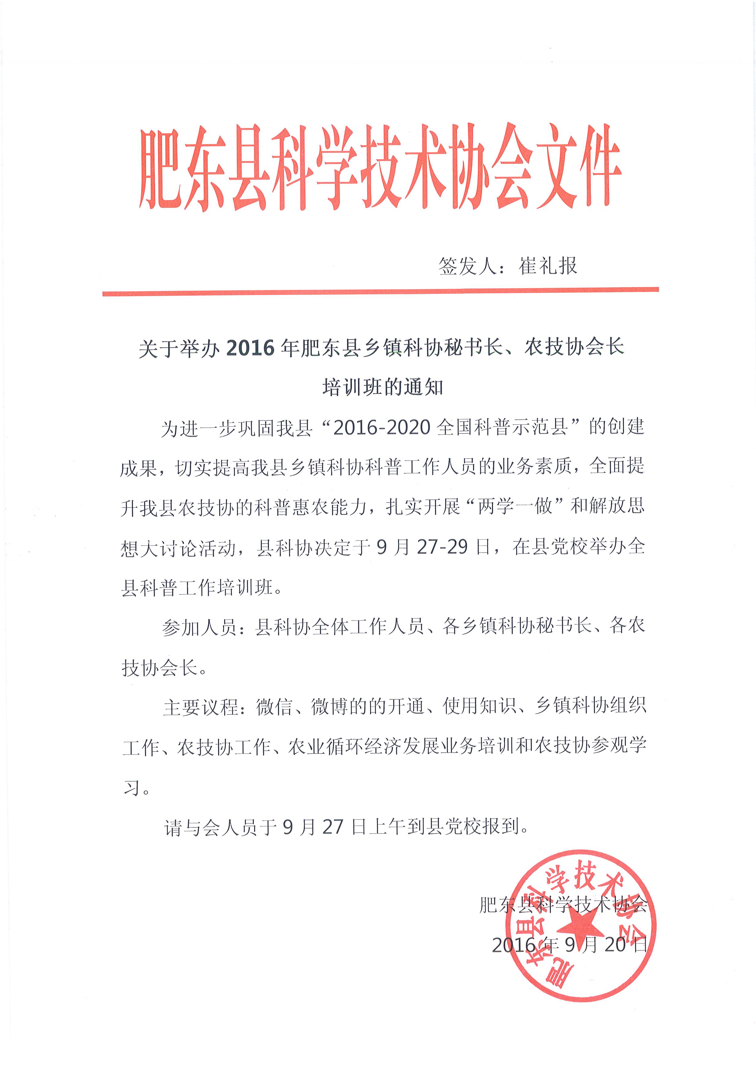 关于举办2016年肥东县乡镇科协秘书长、农技协会长培训班的通知