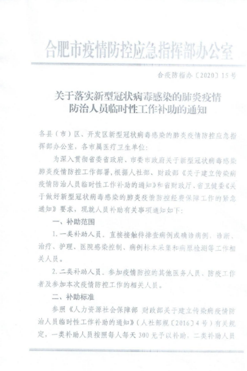 现将《关于落实新型冠状病毒感染的肺炎疫情防治人员临时性工作补助的通知》(合疫防指办〔2020〕15号)转发给你们,请认真抓好贯彻落实。