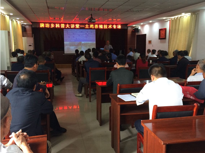 9月21日上午,兴庙社区王大哥早早起床,照看一下养殖的200只鸡后,便匆匆赶往乡政府。在全国科普日之际,牌坊乡正举办“科普大讲堂——农技协专场”之土鸡养殖技术,他和乡里其他养殖户一起热情高涨地前来听讲。