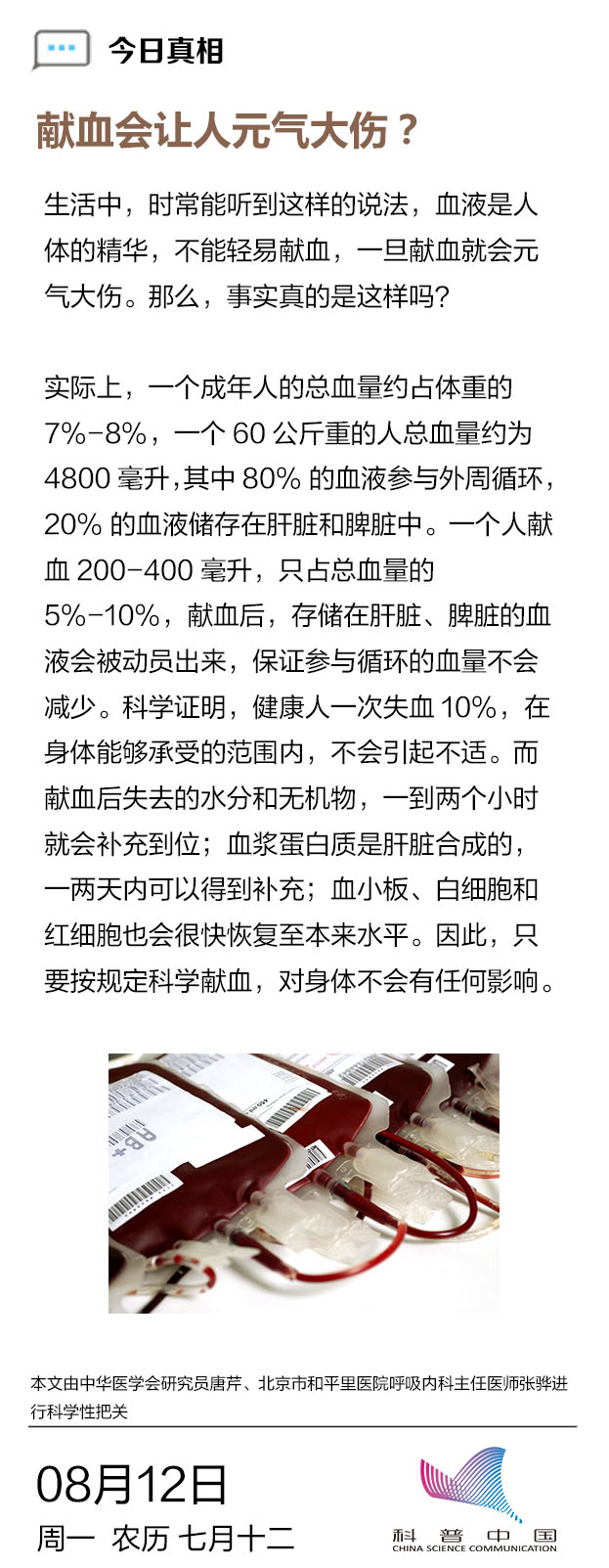 [今日真相]献血会让人元气大伤?