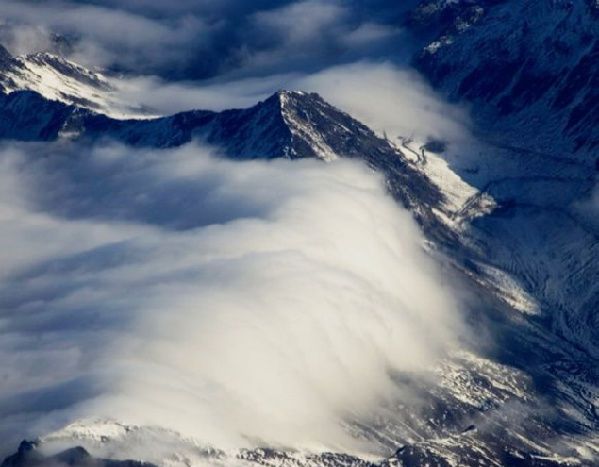 积云有时也呈碟状(有人称之为飞碟云),它的曲线非常光滑,仿佛被精心打磨过。飞碟云的形成,有时是在上升气流与下沉气流的汇合处,有时则与山地地形有关。我国很多地方都有可能见到这种云:珠穆朗玛峰、南迦巴瓦峰、乔戈里峰、四姑娘山、贡嘎山等。