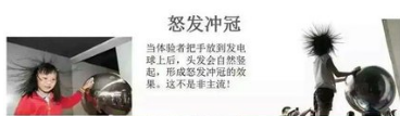 具体操作:表演者站在绝缘台上,手触摸在高压静电球上,这时表演者的头发上带有与静电球相同极性的电荷,由于同性相斥的原因,出现“怒发冲冠”的景现。EST602/606人体静电表演装置: 静电魔球旁体验“怒发冲冠:静电发生器是一件很神奇的物理实验道具,当你把手放在它表面时,你的头发就会不可思议地竖起来,这是由于静电电荷作用力的效果。表演者站在绝缘台上,手触摸在高压静电球上,这时表演者的头发上带有与静电球相同极性的电荷,由于同性相斥的原因,出现“怒发冲冠”的景现。利用EST602/606人体静电表演装置,使人头发竖立的现象,即“怒发冲冠”。