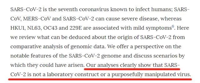 △《自然医学》文章:新冠病毒不是在实验室中构建的,也不是有目的性的人为操控的病毒。
