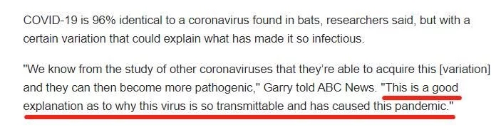 加里对美国广播公司新闻说:“我们从对其他冠状病毒的研究中得知,病毒能够获得这种变异,然后它们会变得更具致病性。这很好地解释了为什么这种病毒如此容易传播并导致了目前的大流行。”