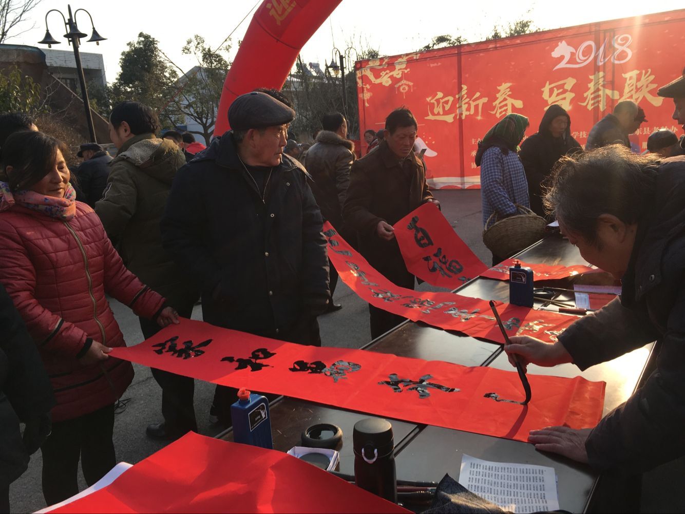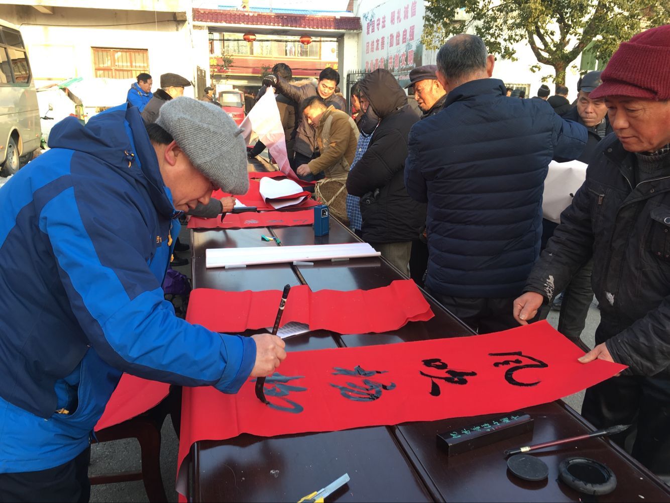 2月3日,肥东县陈集镇街道红幅高悬,由县科协以及县老科协、县文明办等单位共同举办的“迎新春、写春联、赠春联、送祝福”下乡服务活动在这里进行。8位书法精英饱蘸激情,走笔新春,神情投入,书写着他们事先准备好的春联佳句,为群众送去了新春的祝福。