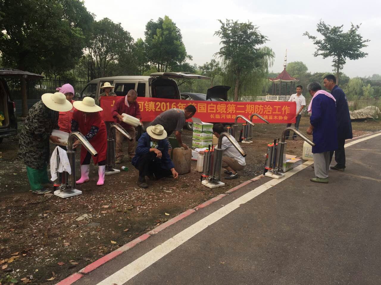 长临河镇位于巢湖北岸,林木植被较为丰厚。为有效防治美国白蛾,由肥东县长临河镇苗木协会牵头,组织20多名精干技术人员,实行统一技术培训,统一配药喷施,对长临河镇辖区内24家重点造林企业大户和各村山地、林地进行第二期美国白蛾防治工作,采用烟雾机喷撒灭幼脲、苦参碱和阿维菌素等灭虫低毒药物进行防治,对防治地块实行包干到人,并进行登记造册,确保了防治区域全覆盖,防治面积无遗漏。