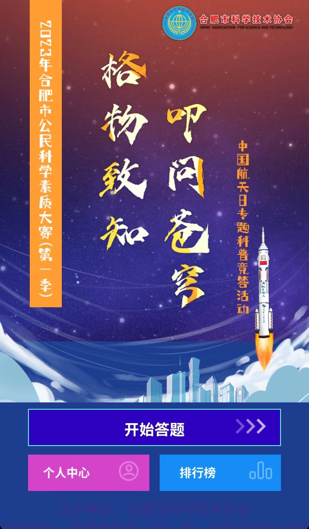 此次航天知识网络竞赛关注“合肥科普合肥科协”微信公众号,点击底部菜单栏“全民科普”—“全民科学素质竞赛”即可进入答题页面,首次答题先选择“开始答题”后进行信息验证,填写姓名、手机号码,并选择地区,系统将随机从题库中抽取航天相关问题,线上向公众普及航空航天知识。
