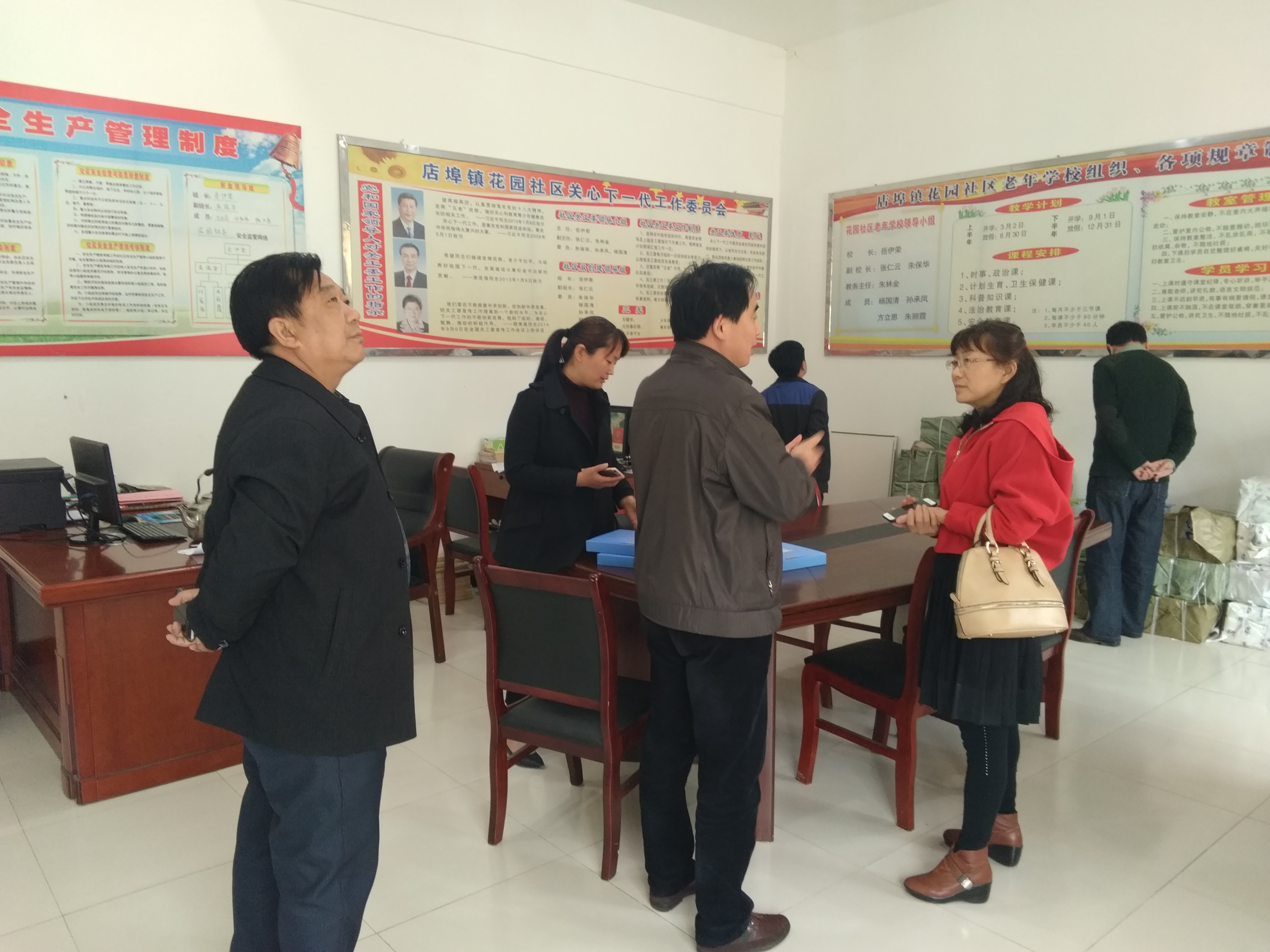 县科协人员在店埠镇花园社区察看科普活动站和档案资料