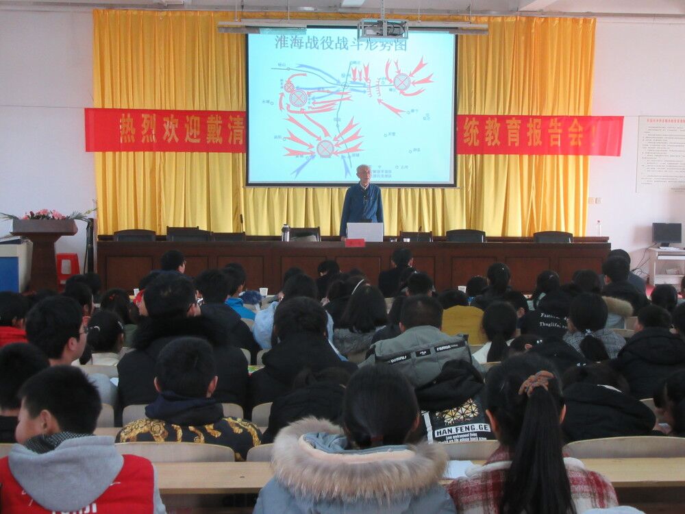 戴老先后参加淮海战役、渡江战役、上海战役、福厦战役,出生入死,屡立战功。解放后在人武部、教育局、科技局等单位担任领导工作。在2个半小时的报告会上,戴老声音铿锵有力,结合自身的战斗岁月绘声绘色讲述淮海战役的三个阶段,讲到动情处还不顾寒冷脱下朴素的外套军装,台下师生无不动容,报以经久不息的掌声,报告会后大家纷纷请戴老签字留念。