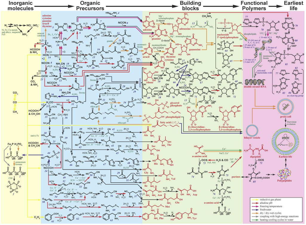 在这篇综述中,我们总结了与这个主题相关的生命前化学的理论和实验发现,包括生物必需元素N和 P,生命构件(氨基酸、多肽、核糖、核酸酶、脂肪酸、核苷酸和寡核苷酸)的非生物合成,它们聚合成生物大分子(多肽和寡核苷酸),以及复制和区室化生物学功能的出现。