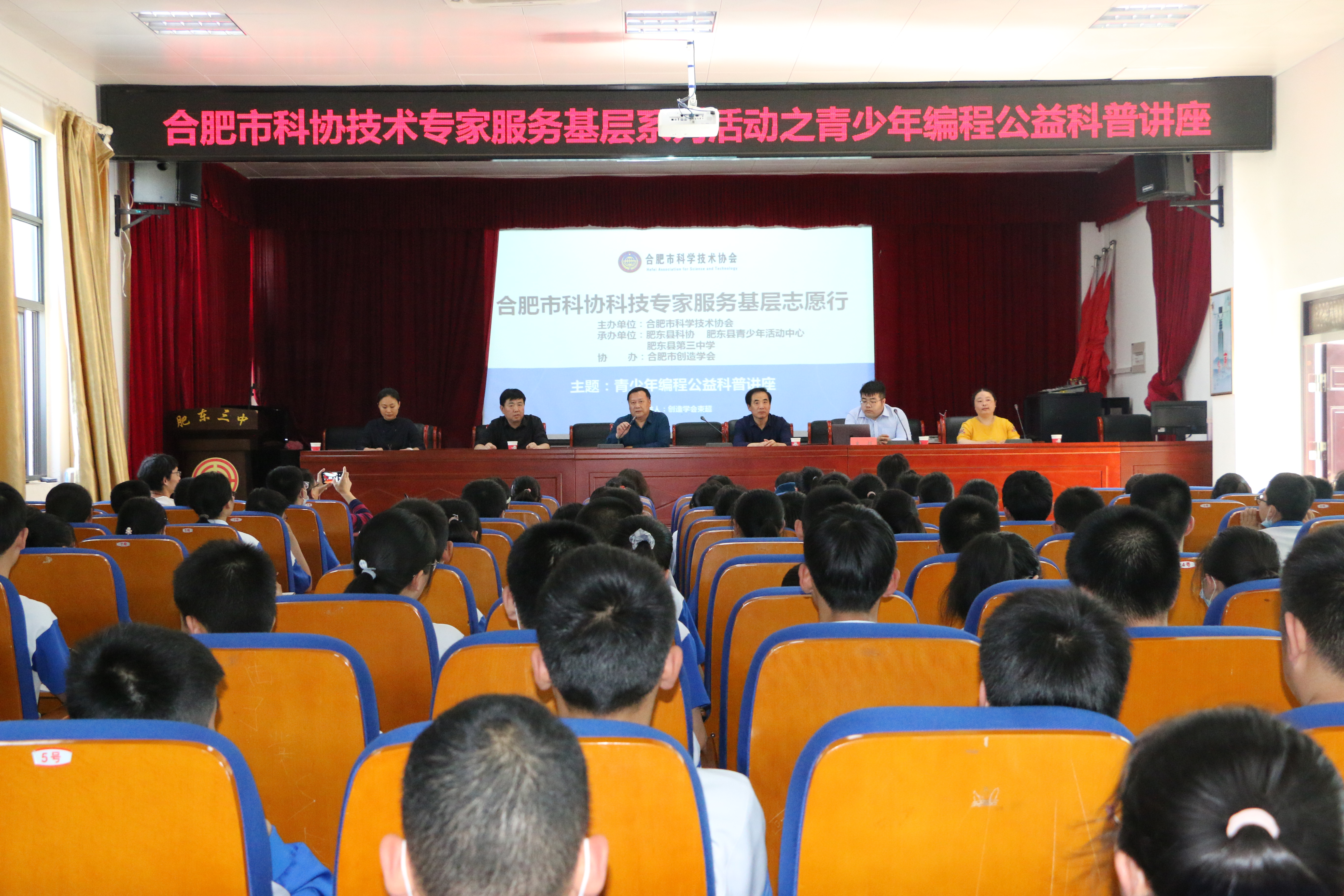 科技放飞梦想,创新开拓未来。为了响应党的十九届五中全会提出的深入实施科教兴国、人才强国、创新驱动等国家战略,2021年5月8号下午3点,合肥市科协技术专家服务基层系列活动之青少年编程公益科普讲座在肥东三中总部多功能报告厅热烈开展。