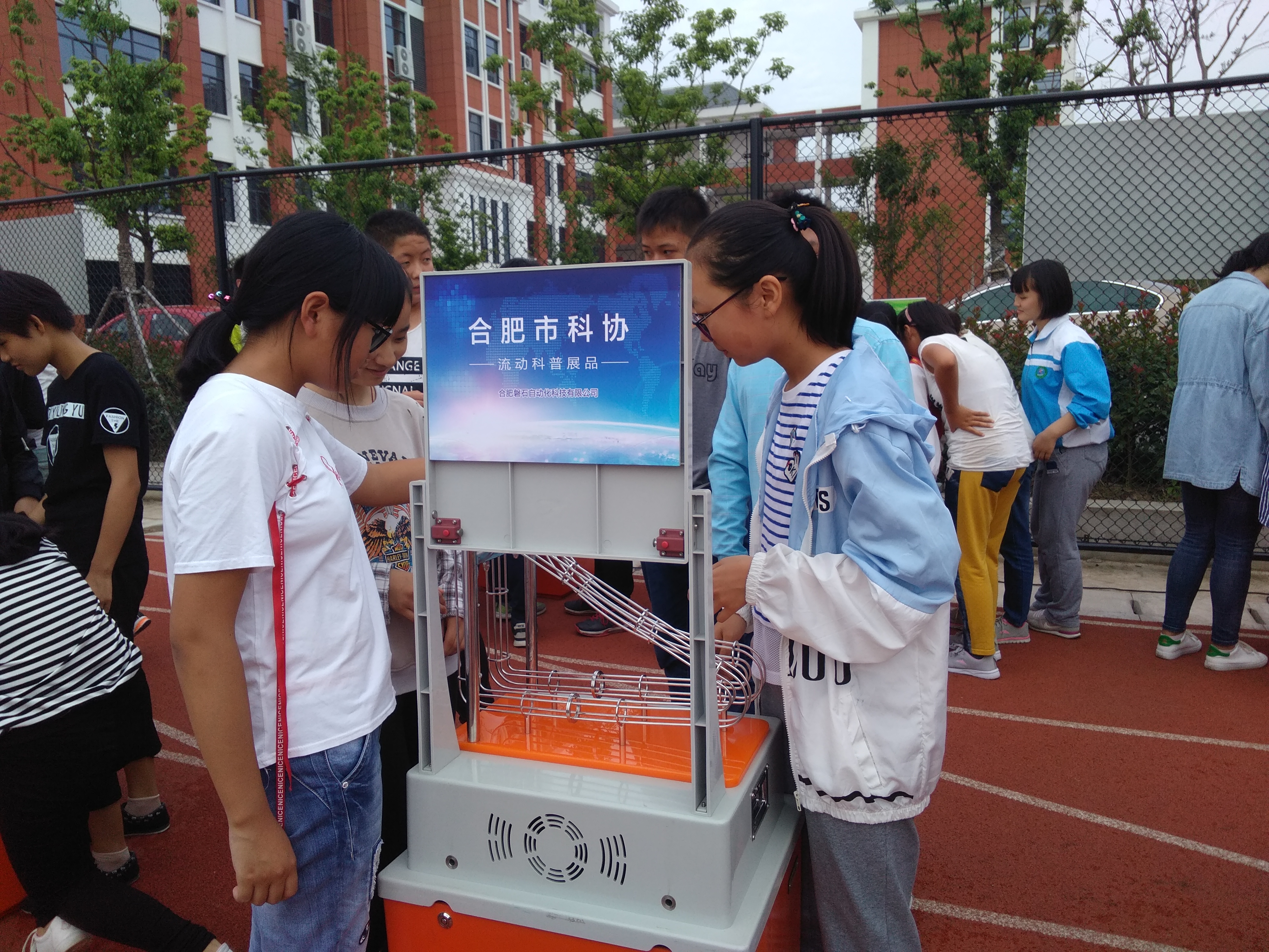 在学校的操场上,合肥市科技馆组织10组的流动科普展品,吸引了众多学生的眼球,一组组同学蜂拥而上,亲手操作科普展品,体验科技的神奇魅力。